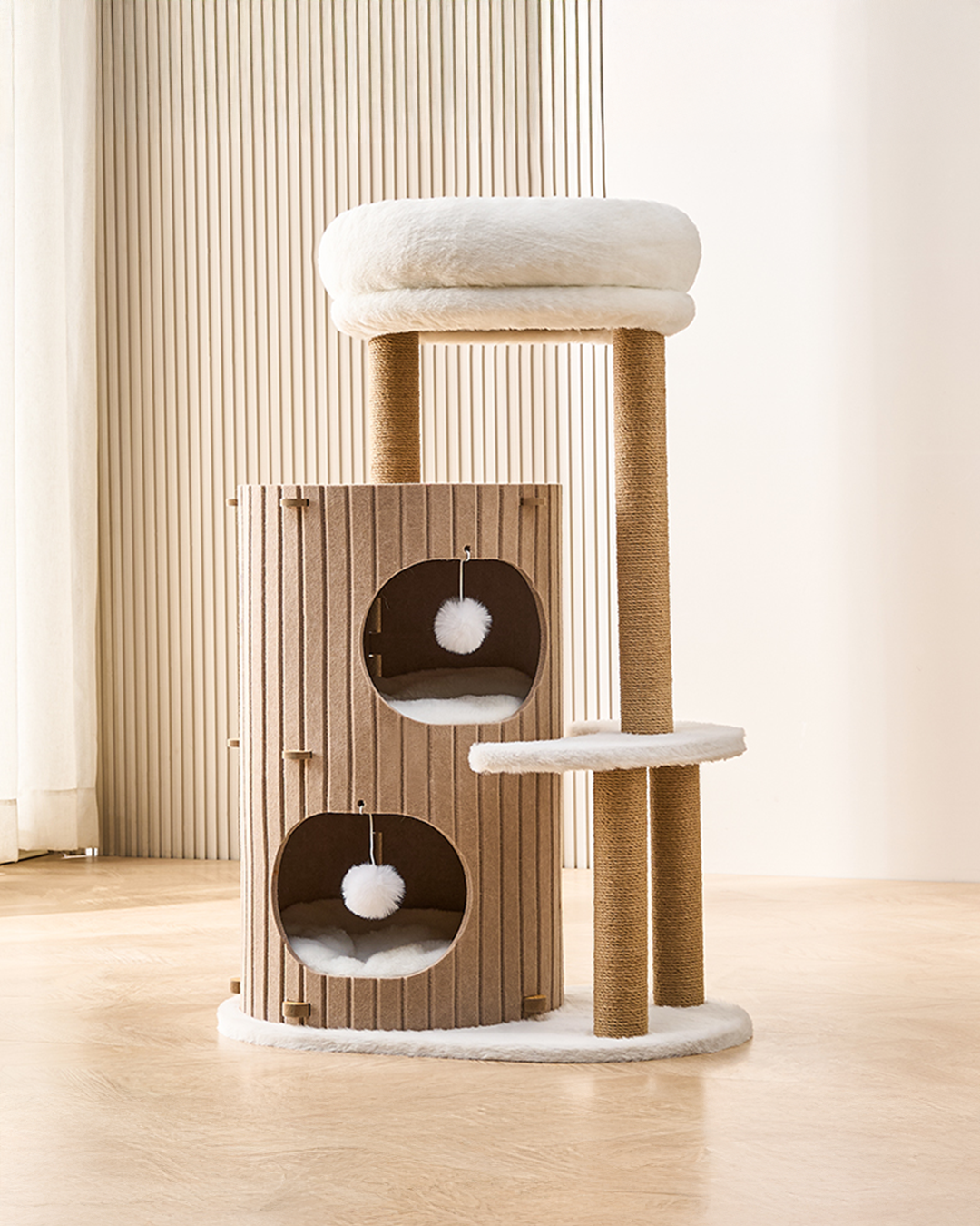 De zachte bekleding van vilt en luxe, konijnenachtig synthetisch materiaal zorgt voor een warme en uitnodigende omgeving. Dankzij de stevige binnenconstructie is de krabpaal stabiel en duurzaam — perfect voor dagelijks gebruik.